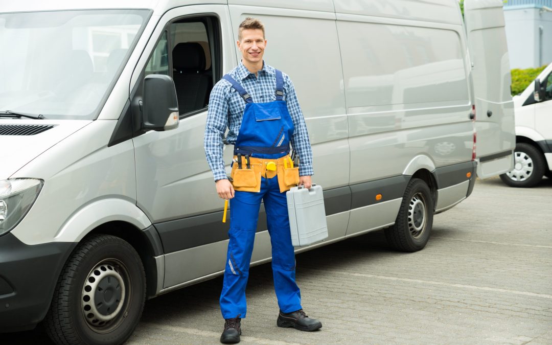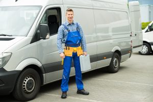 Repairman With Tools And Toolbox In Front Of Van